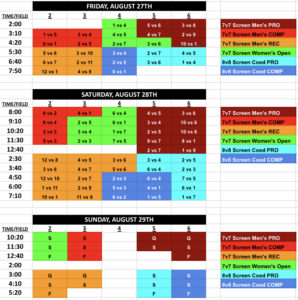 Pool Play Seeding is based on when you select your first game during the draft. All teams with 4 or more teams in their division will battle to select their placement on the schedule, where you’ll have a say in who you play, what time and on what field. Captains will select which seed they want on the schedule in reverse order of their registration date, and you can take any spot on the board, bumping out another team if desired, who would be forced to take an open spot.