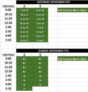 Pool Play Seeding is based on when you select your first game during the draft. All teams with 4 or more teams in their division will battle to select their placement on the schedule, where you’ll have a say in who you play, what time and on what field. Captains will select which seed they want on the schedule in reverse order of their registration date, and you can take any spot on the board, bumping out another team if desired, who would be forced to take an open spot.