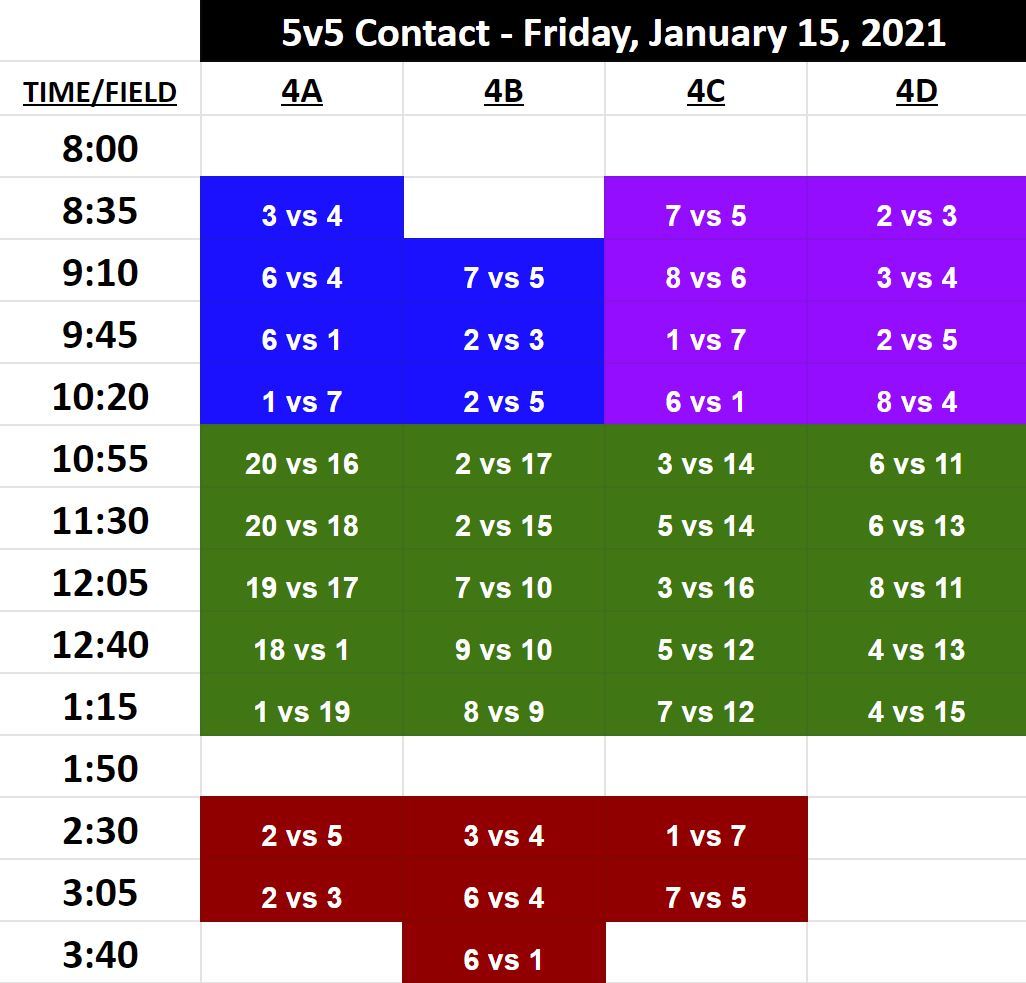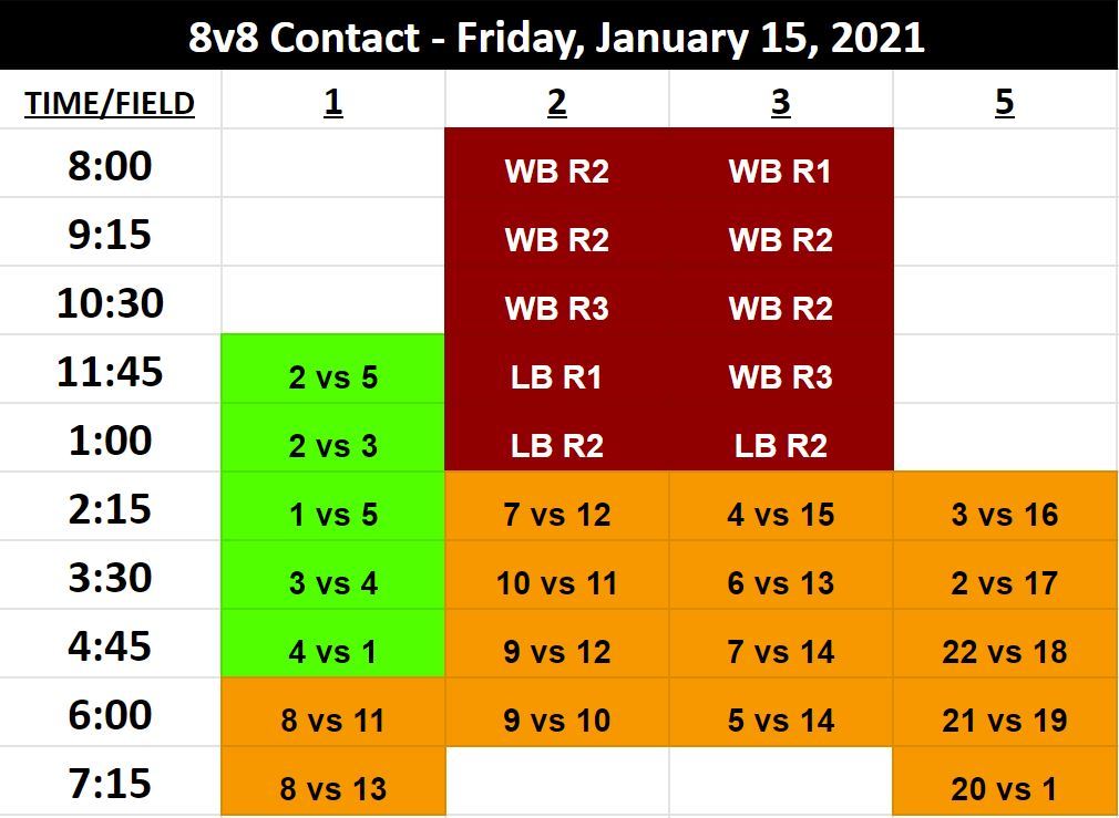 Team A has the least Ranking Points and selects first, and is on the clock (1 minute to decide) . They select the 5th seed on the schedule so they can start at a later time. Team B is up next, and selects the 1st seed to avoid being in the same pool as Team A. Team C is up next, and decides they want to bump Team A out of their spot and steals the 5th seed. Team A then is forced to take an open spot on the board, and selects the 2nd seed place themselves in the same pool as Team B who they think they matchup well against. This continues all the way through the draft until the last 3 teams are left. The only rule exception is that if any of the top teams (top 3 teams for divisions with 19 or less teams; top 4 teams for divisions 20+ teams; top 5 teams for divisions with 30+ teams) get bumped out of their spot, they are allowed to bump again. So if Team Z has the most points and is the last to draft and bumps Team X out of their spot who was also one of the top teams, Team X would be allowed to bump another team out so they’re not stuck with the only open spot on the board having earned one of the top team spots draft position. The team they bump would have to take the last open spot on the board, and the draft would be complete! It is a fun way to select your pool play positions and gives each team some input on when, where and who they play!