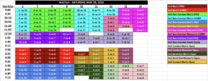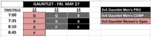 Team A has the registered last and selects first, and is on the clock (1 minute to decide) . They select the 5th seed on the schedule so they can start at a later time. Team B is up next, and selects the 1st seed to avoid being in the same pool as Team A. Team C is up next, and decides they want to bump Team A out of their spot and steals the 5th seed. Team A then is forced to take an open spot on the board, and selects the 2nd seed to place themselves in the same pool as Team B who they think they matchup well against. This continues all the way through the draft until the last 3 teams are left. The only rule exception is that if any of the top teams (top 3 teams for divisions with 19 or less teams; top 4 teams for divisions 20+ teams; top 5 teams for divisions with 30+ teams) get bumped out of their spot, they are allowed to bump again. So if Team Z has the registered first and is the last to draft and bumps Team X out of their spot who was also one of the top teams, Team X would be allowed to bump another team out so they’re not stuck with the only open spot on the board having earned one of the top team spots draft position. The team they bump would have to take the last open spot on the board, and the draft would be complete! It is a fun way to select a spot and gives each team some input on when, where and who they play!