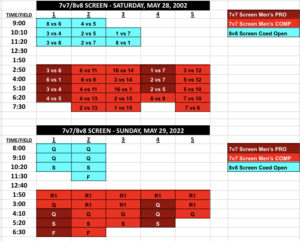 Pool Play Seeding is based on when you select your first game during the draft. All teams with 4 or more teams in their division will battle to select their placement on the schedule, where you’ll have a say in who you play, what time and on what field. Captains will select which seed they want on the schedule in reverse order of their registration date, and you can take any spot on the board, bumping out another team if desired, who would be forced to take an open spot.