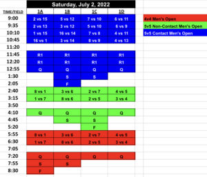 Team A has the registered last and selects first, and is on the clock (1 minute to decide) . They select the 5th seed on the schedule so they can start at a later time. Team B is up next, and selects the 1st seed to avoid being in the same pool as Team A. Team C is up next, and decides they want to bump Team A out of their spot and steals the 5th seed. Team A then is forced to take an open spot on the board, and selects the 2nd seed to place themselves in the same pool as Team B who they think they matchup well against. This continues all the way through the draft until the last 3 teams are left. The only rule exception is that if any of the top teams (top 3 teams for divisions with 19 or less teams; top 4 teams for divisions 20+ teams; top 5 teams for divisions with 30+ teams) get bumped out of their spot, they are allowed to bump again. So if Team Z has the registered first and is the last to draft and bumps Team X out of their spot who was also one of the top teams, Team X would be allowed to bump another team out so they’re not stuck with the only open spot on the board having earned one of the top team spots draft position. The team they bump would have to take the last open spot on the board, and the draft would be complete! It is a fun way to select a spot and gives each team some input on when, where and who they play!