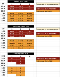 Pool Play Seeding is based on when you select your first game during the draft. All teams with 4 or more teams in their division will battle to select their placement on the schedule, where you’ll have a say in who you play, what time and on what field. Captains will select which seed they want on the schedule in reverse order of their registration date, and you can take any spot on the board, bumping out another team if desired, who would be forced to take an open spot.