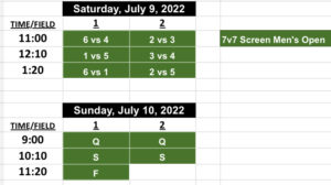 Pool Play Seeding is based on when you select your first game during the draft. All teams with 4 or more teams in their division will battle to select their placement on the schedule, where you’ll have a say in who you play, what time and on what field. Captains will select which seed they want on the schedule in reverse order of their registration date, and you can take any spot on the board, bumping out another team if desired, who would be forced to take an open spot.