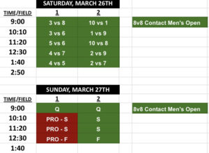 Pool Play Seeding is based on when you select your first game during the draft. All teams with 4 or more teams in their division will battle to select their placement on the schedule, where you’ll have a say in who you play, what time and on what field. Captains will select which seed they want on the schedule in reverse order of their registration date, and you can take any spot on the board, bumping out another team if desired, who would be forced to take an open spot.