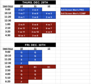 Pool Play Seeding is based on when you select your first game during the draft. All teams with 4 or more teams in their division will battle to select their placement on the schedule, where you’ll have a say in who you play, what time and on what field. Captains will select which seed they want on the schedule in reverse order of their registration date, and you can take any spot on the board, bumping out another team if desired, who would be forced to take an open spot.
