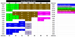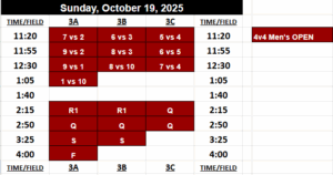 Team A has the registered last and selects first, and is on the clock (1 minute to decide) . They select the 5th seed on the schedule so they can start at a later time. Team B is up next, and selects the 1st seed to avoid being in the same pool as Team A. Team C is up next, and decides they want to bump Team A out of their spot and steals the 5th seed. Team A then is forced to take an open spot on the board, and selects the 2nd seed to place themselves in the same pool as Team B who they think they matchup well against. This continues all the way through the draft until the last 3 teams are left. The only rule exception is that if any of the top teams (top 3 teams for divisions with 19 or less teams; top 4 teams for divisions 20+ teams; top 5 teams for divisions with 30+ teams) get bumped out of their spot, they are allowed to bump again. So if Team Z has the registered first and is the last to draft and bumps Team X out of their spot who was also one of the top teams, Team X would be allowed to bump another team out so they’re not stuck with the only open spot on the board having earned one of the top team spots draft position. The team they bump would have to take the last open spot on the board, and the draft would be complete! It is a fun way to select a spot and gives each team some input on when, where and who they play!