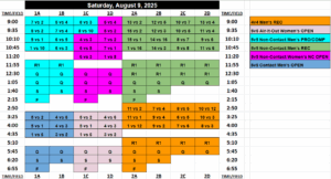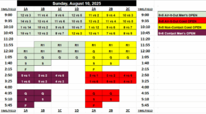 Team A has the registered last and selects first, and is on the clock (1 minute to decide) . They select the 5th seed on the schedule so they can start at a later time. Team B is up next, and selects the 1st seed to avoid being in the same pool as Team A. Team C is up next, and decides they want to bump Team A out of their spot and steals the 5th seed. Team A then is forced to take an open spot on the board, and selects the 2nd seed to place themselves in the same pool as Team B who they think they matchup well against. This continues all the way through the draft until the last 3 teams are left. The only rule exception is that if any of the top teams (top 3 teams for divisions with 19 or less teams; top 4 teams for divisions 20+ teams; top 5 teams for divisions with 30+ teams) get bumped out of their spot, they are allowed to bump again. So if Team Z has the registered first and is the last to draft and bumps Team X out of their spot who was also one of the top teams, Team X would be allowed to bump another team out so they’re not stuck with the only open spot on the board having earned one of the top team spots draft position. The team they bump would have to take the last open spot on the board, and the draft would be complete! It is a fun way to select a spot and gives each team some input on when, where and who they play!
