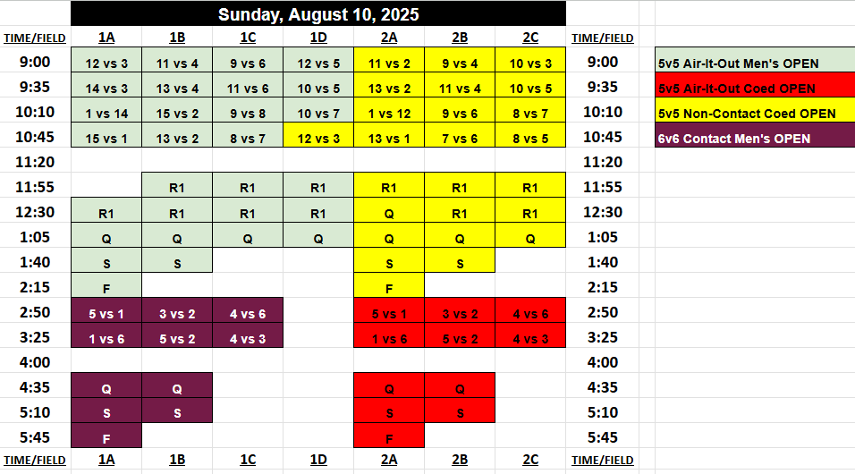 Pool Play Seeding is based on when you select your first game during the draft. All teams with 4 or more teams in their division will battle to select their placement on the schedule, where you’ll have a say in who you play, what time and on what field. Captains will select which seed they want on the schedule in reverse order of their registration date, and you can take any spot on the board, bumping out another team if desired, who would be forced to take an open spot.