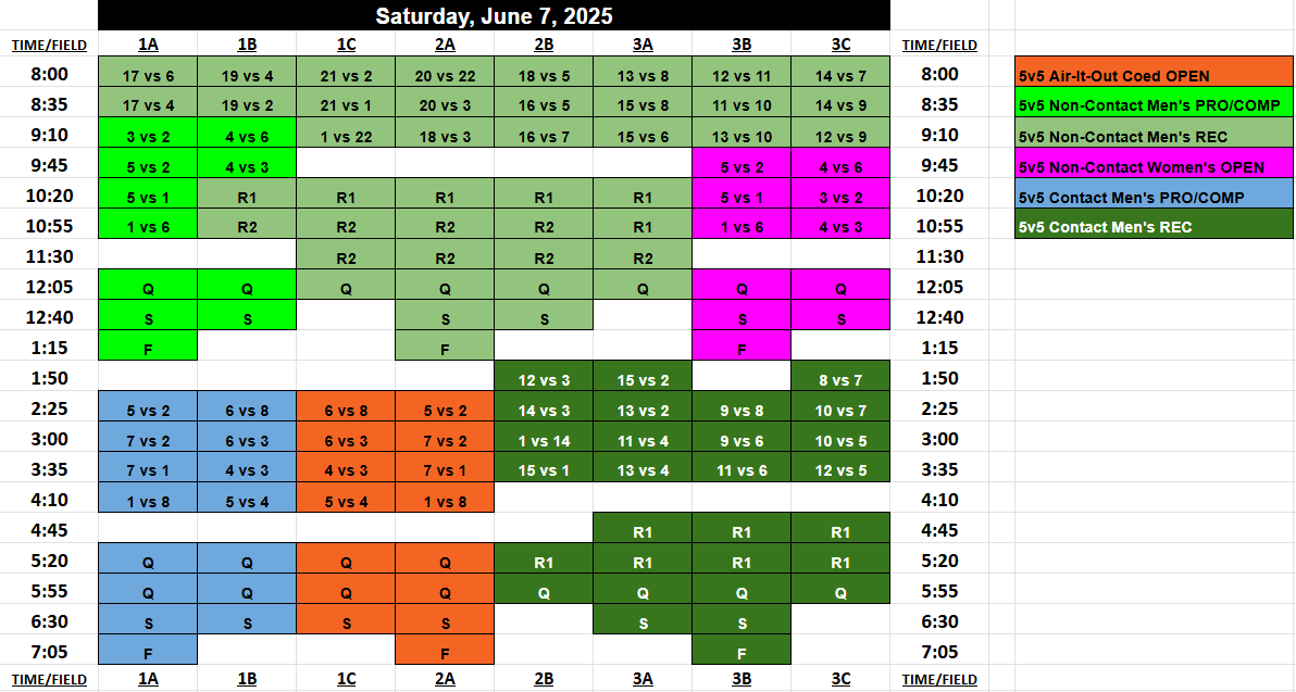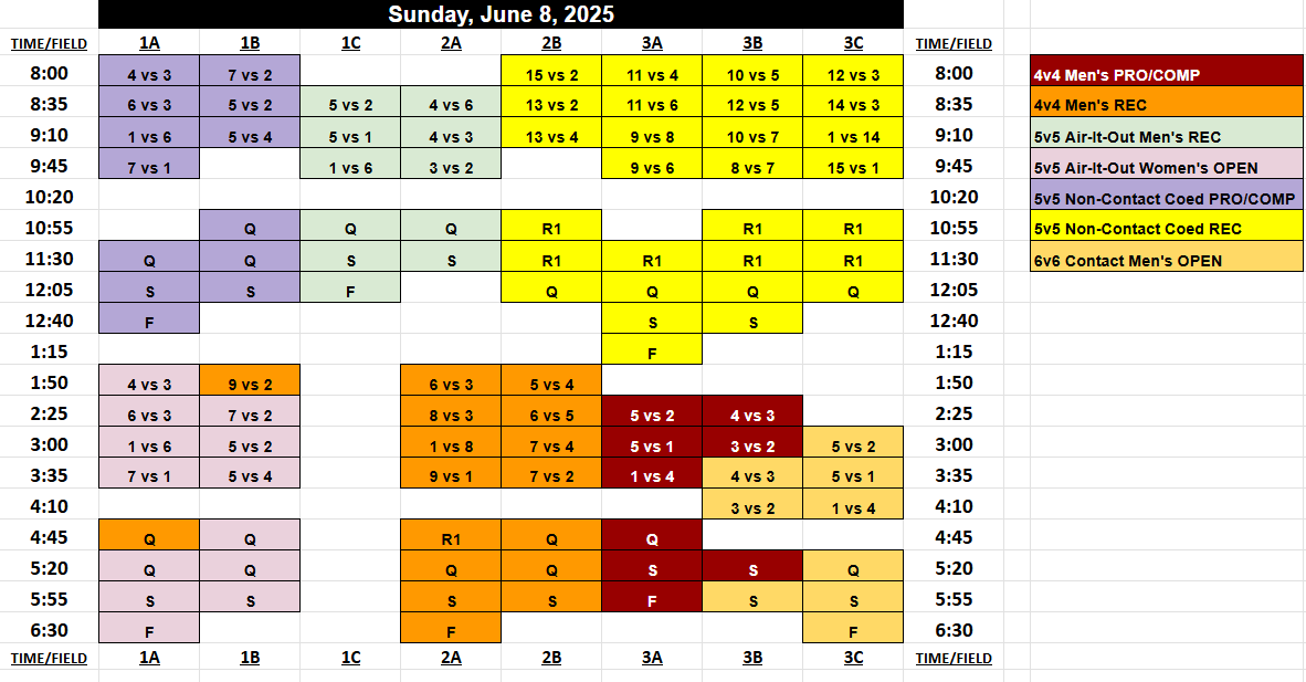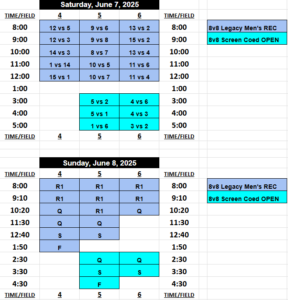 Pool Play Seeding is based on when you select your first game during the draft. All teams with 4 or more teams in their division will battle to select their placement on the schedule, where you’ll have a say in who you play, what time and on what field. Captains will select which seed they want on the schedule in reverse order of their registration date, and you can take any spot on the board, bumping out another team if desired, who would be forced to take an open spot.