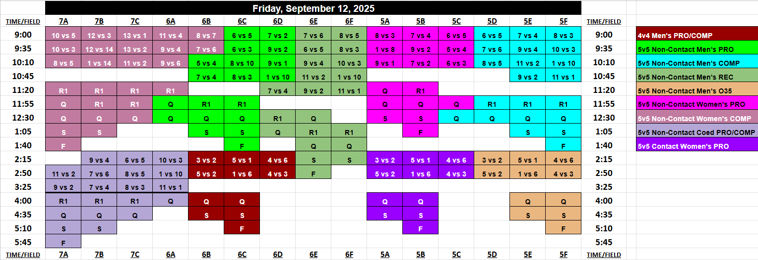 Pool Play Seeding is based on when you select your first game during the draft. All teams with 4 or more teams in their division will battle to select their placement on the schedule, where you’ll have a say in who you play, what time and on what field. Captains will select which seed they want on the schedule in reverse order of their registration date, and you can take any spot on the board, bumping out another team if desired, who would be forced to take an open spot.