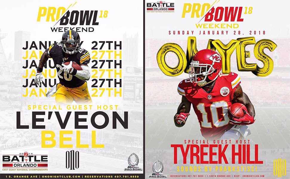 AFTER PARTIES will be held on Saturday and Sunday night at Club Ono with special guests Le’Veon Bell on Saturday and Tyreek Hill on Sunday! To make reservations for your team contact 407-701-9859.