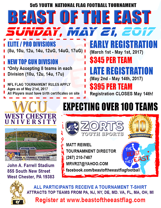 The Beast of the East is an annual flag football event and one of the top tournaments in the United States for youth NFL Flag Teams and Organizations. (Multiple Divisions within) 6u, 8u, 10u, 12u, 14u, 17u, 12uG, 14uG, 17uG