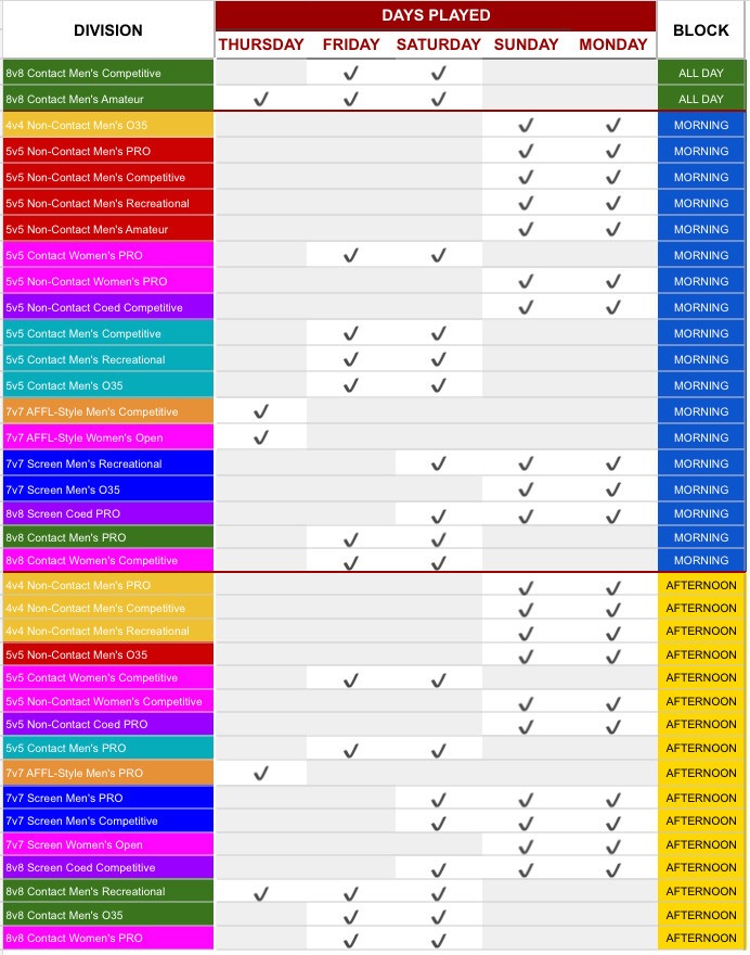 With the exception of 8v8 Contact Men’s Comp & Amateur, we’re able to do schedule blocks so you’re guaranteed to be able to play in at least 2 contact styles (1 morning, 1 afternoon) and 2 non-contact styles (1 morning and 1 afternoon). You can still play in multiple styles that may overlap, but we cannot guarantee anything and will not be accommodating any schedule requests.