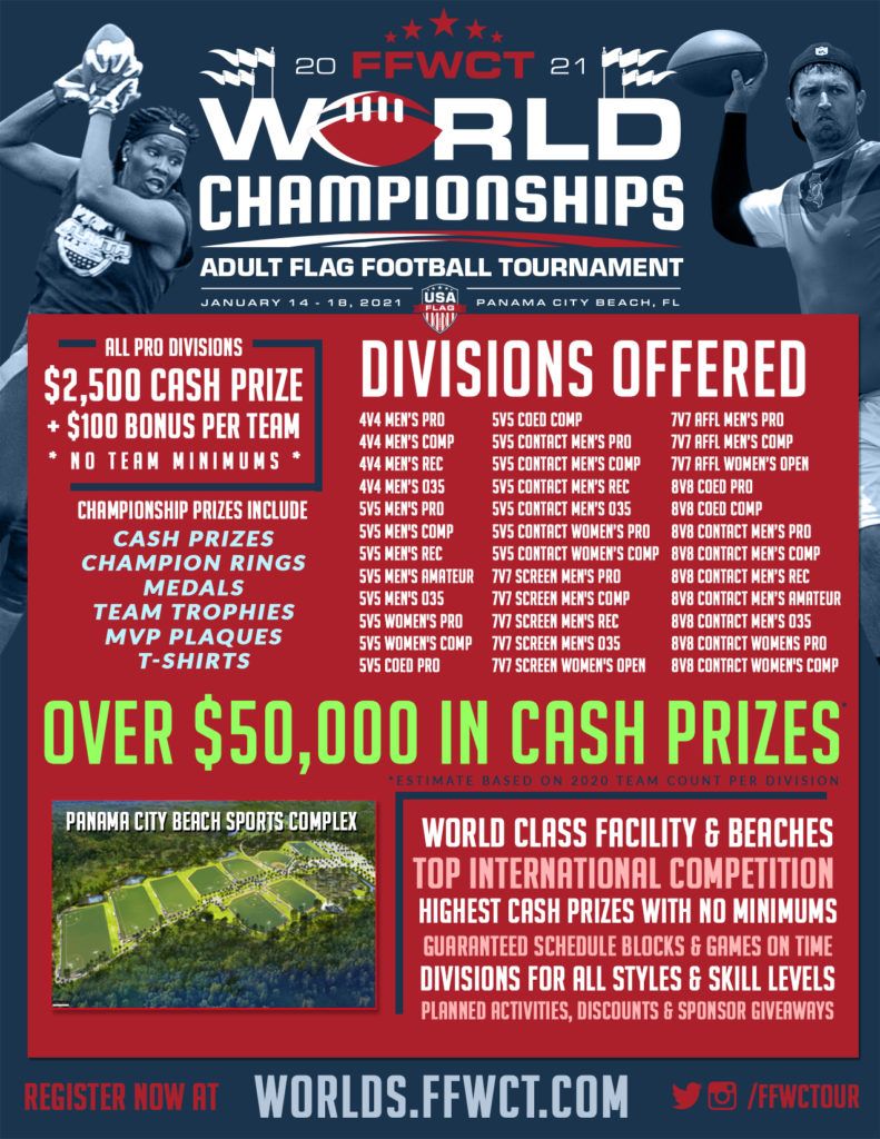 Each division does have a maximum amount of teams that can be accepted and divisions do fill up quickly! Although we have increased the cap in many divisions, we still expect to each one to sell out. So it is important that you register your team early to guarantee your place in the largest flag football tournament in the world! You can see how many spots are left by going to the team list page here.