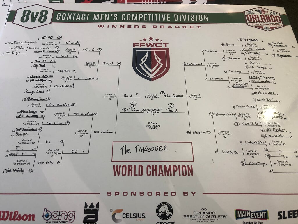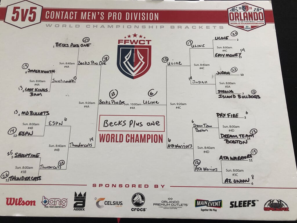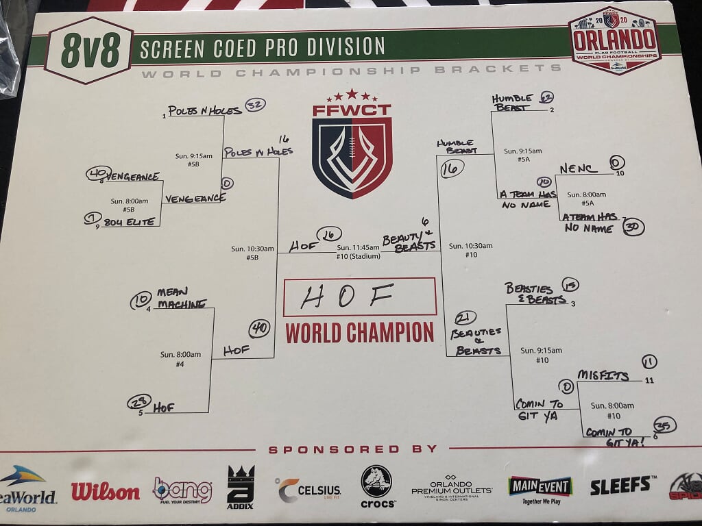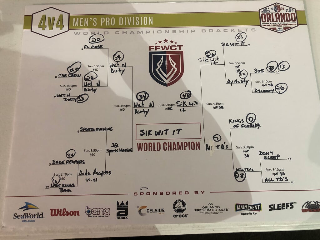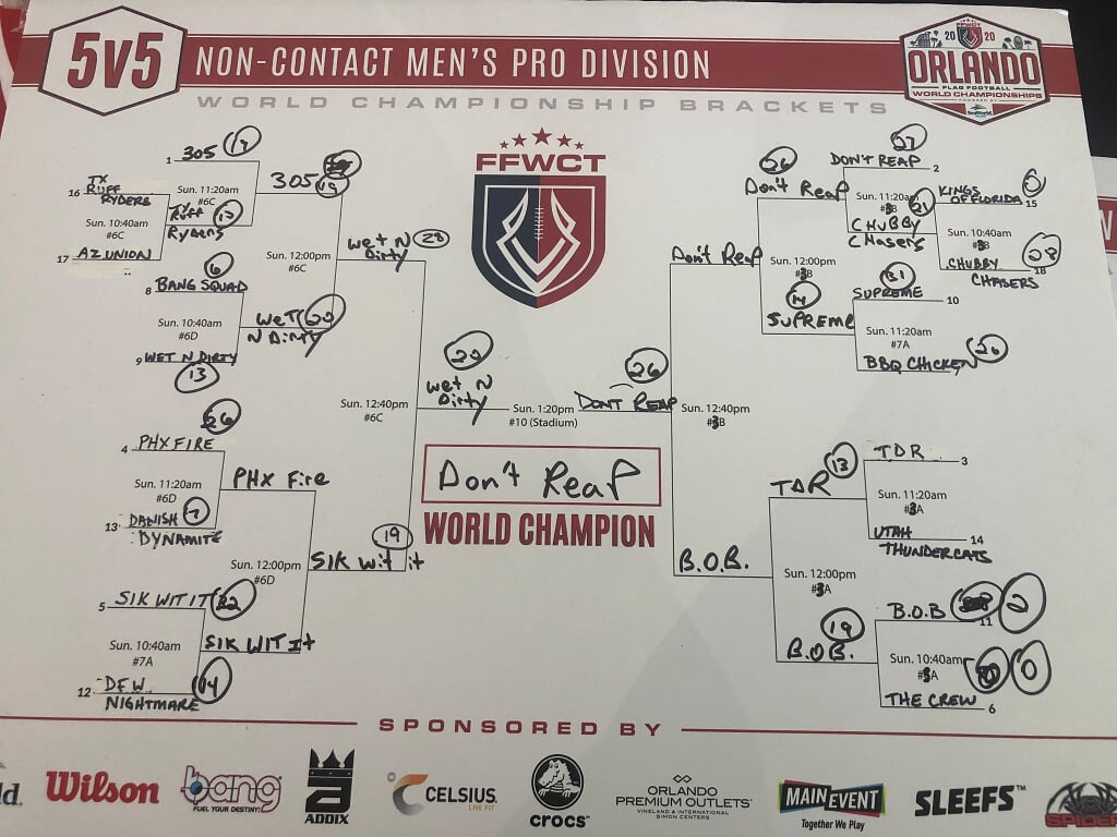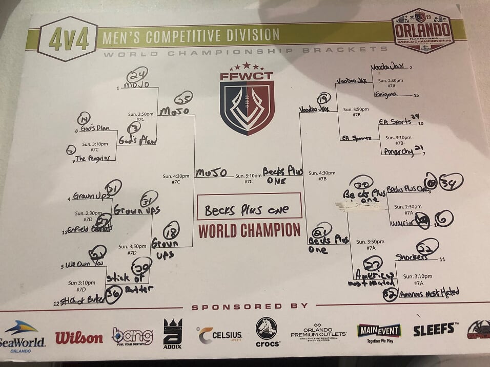 The 2020 FFWCT Orlando World Championship results are in after an amazing tournament that featured 612 adult teams from all over the world participating at the beautiful Austin Tindall Sports Complex in Orlando, FL on January 17, 18 & 19! Players experienced amazing weather, got to mingle with sponsors and vendors at the Draft Meeting at SeaWorld Orlando, as well as on-site, and play against some of the top competition in the world! Below are the final results. Click the button below to view a spreadsheet with full standings and Ranking Points earned.