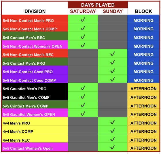 The graphic below lays out which divisions will and will not overlap, along with days played. The morning block will not conflict with the afternoon block AT ALL. So teams can play in a morning style and an afternoon style with no conflicts.
