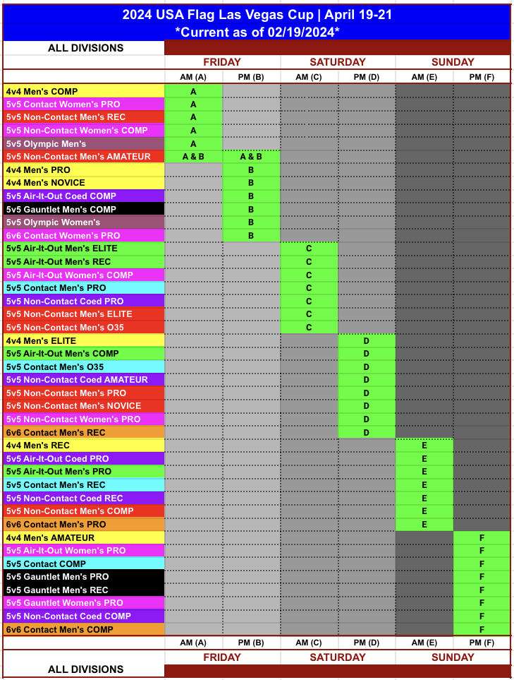 Below are the divisions offered at this tournament along with their entry cost, prize and roster max. Competitive levels are PRO (A), Elite (B), Competitive (C), Novice (D) and Amateur (E). If you are not certain which division is right for you or what it overlaps with, please email us at natalie@ffwct.com to make sure!