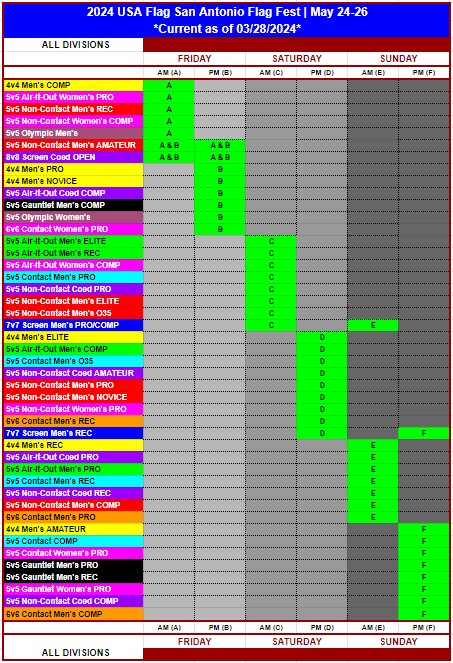 The graphic below lays out which divisions will and will not overlap, along with days played. The morning block will not conflict with the afternoon block AT ALL. So teams can play in a morning style and an afternoon style with no conflicts.