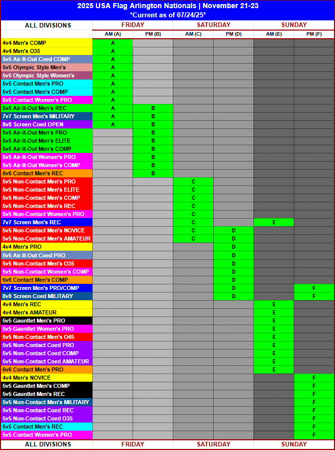 Below are the divisions offered at this tournament along with their entry cost, prize and roster max. Competitive levels are PRO (A), Elite (B), Competitive (C), Novice (D) and Amateur (E). If you are not certain which division is right for you or what it overlaps with, please email us at natalie@ffwct.com to make sure!