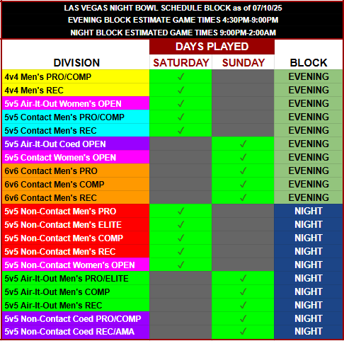 The graphic below lays out which divisions will and will not overlap, along with days played. The morning block will not conflict with the afternoon block AT ALL. So teams can play in a morning style and an afternoon style with no conflicts.