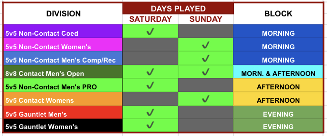 The graphic below lays out which divisions will and will not overlap, along with days played. The morning block will not conflict with the afternoon block AT ALL. So teams can play in a morning style and an afternoon style with no conflicts.