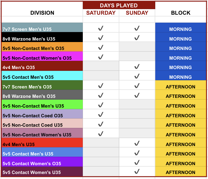 The graphic below lays out which divisions will and will not overlap, along with days played. The morning block will not conflict with the afternoon block AT ALL. So teams can play in a morning style and an afternoon style with no conflicts.