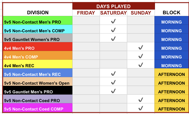 The graphic below lays out which divisions will and will not overlap, along with days played. The morning block will not conflict with the afternoon block AT ALL. So teams can play in a morning style and an afternoon style with no conflicts.