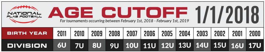 We have standardized our age cutoff Nationwide for this tour. Our Battle Circuit has moved to a birth year cut off date of January 1st of the current year. In an effort to create even more parity within our event structure, we are offering odd year divisions well. In the past we only offered 8U, 10U, 12U, 14U and 16U etc. Now based off of the explosive growth of flag football, we are able to accommodate odd year divisions (7U, 9U, 11U, 13U, 15U and 17Uetc) at most of our events.