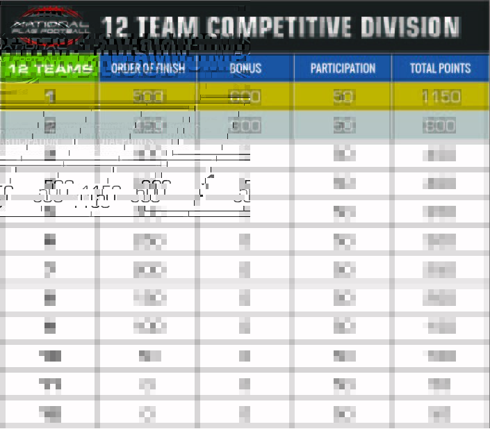 Battle Points will be earned by participating in various FFWCT powered by National Flag Football hosted and affiliated tournaments. You will earn a set amount of Participation Points simply for playing, in addition multiplier points will be awarded based off of your team’s top 10 performance as well as bonus Champion Points for winning a division. See the charts below for a full breakdown of how many points may be earned at each event.